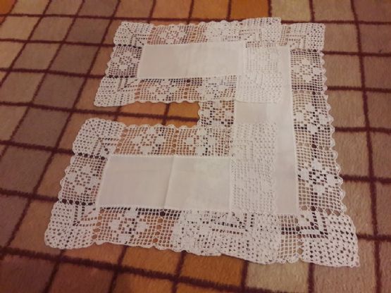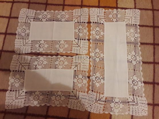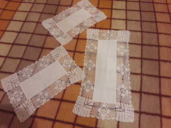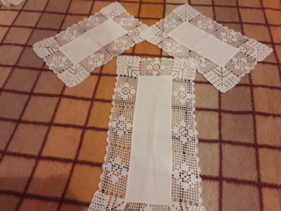 Një centro e madhe me përmasat 55cm x26cmDy centro te vogla me përmasat 40cm x25cmE gjithë qëndisja është e realizuar me dorë në cop lino dhe me fije pambuku.