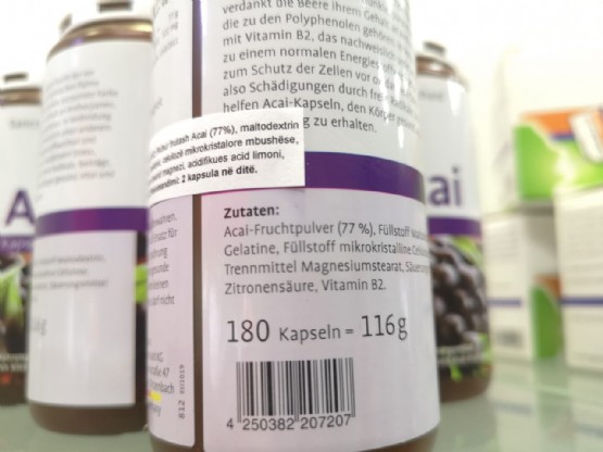- Acai Fruit Powder (77%), mbushës Maltodextrin, Xhelatinë, mbushës Celulozë Mikrokristaline, agjent ndarës Stearati i Magnezit, acidifikues Acid Citrik, Vitamina B2.