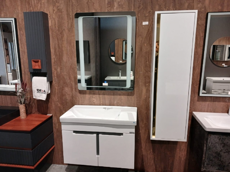 Mobilje tualeti me dizajn modern, Mobilje banjo MDF kunder ujit, Lavaman porcelani per banjo, Pasqyre LED per banjo, Dollap banjo me hapesire te bollshme, Mobilje banjo cilesore, Set mobilje tualeti me pasqyre, Dollap tualeti me MDF te plastifikuar