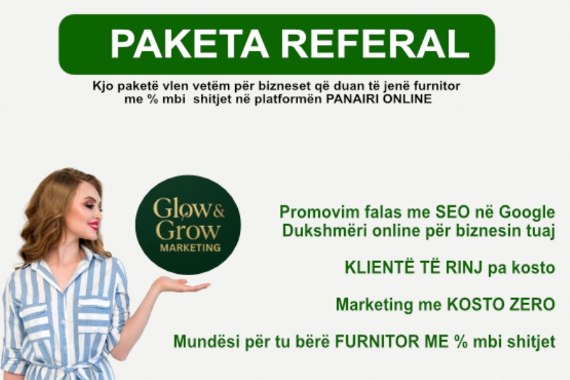Paketa REFERAL LINK, Regjistro biznesin FALAS në Panairi Online, dhe fito klientë të rinj, Promovim falas në Google, Vizibilitet biznesi online, Klientë të rinj pa kosto, Marketing zero risk, Furnitor me % mbi shitje