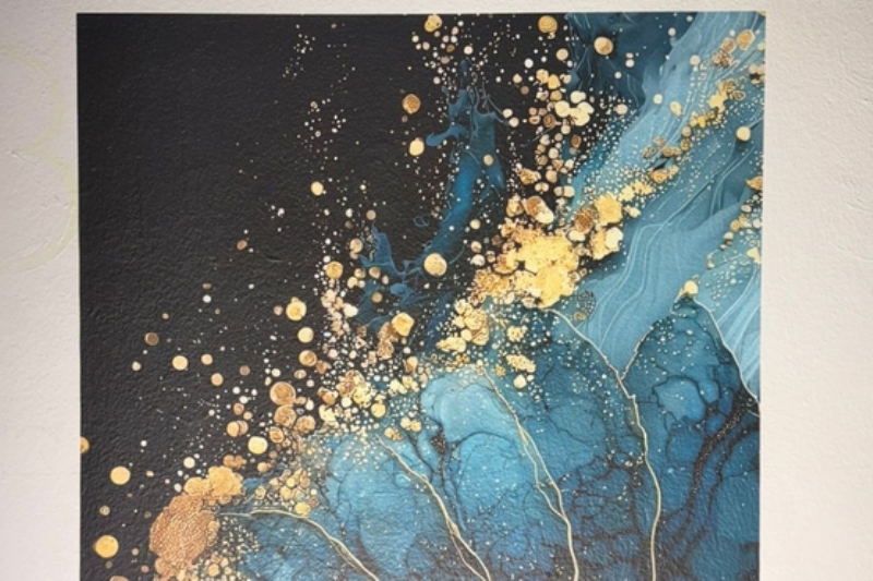 Kjo pikturë abstrakte me tone blu dhe detaje ari krijon një efekt vizual elegant dhe modern. Ngjyrat e thella dhe kontrastet e pasura e bëjnë një zgjedhje ideale për ambiente te rafinuara.