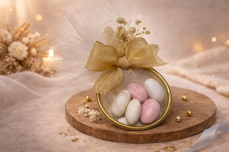 KONFETAT E ARTA realizon unaza dekorative të personalizuara, brenda të cilave vendosen 5 bajame të karamelizuara, të përgatitura me kujdes për të krijuar një kujtim të ëmbël dhe të veçantë.