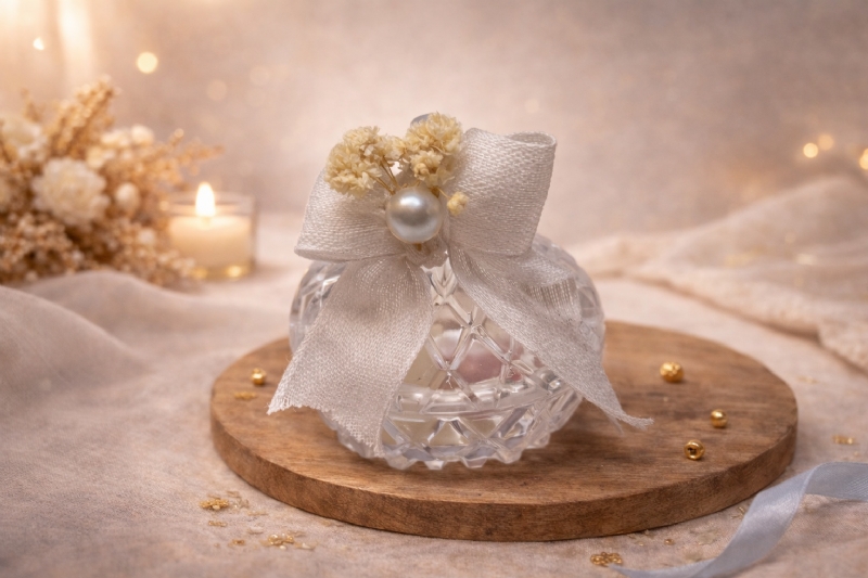 Kavanoz Dekorativ per Fejesa dhe Dasma me Fjongo te Bardhe dhe Perla, Konfete Elegante nga KONFETAT E ARTA, konfeta aristokratike per martese, dhurata high end per evente VIP, paketim me finiture luksoze, sete elitare ceremoniale