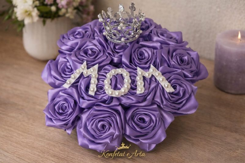 KONFETAT E ARTA realizon rrethe dekorative me lule saten dhe shkrim sipër tyre, si “Mom” ose çdo tekst tjetër sipas dëshirës suaj.